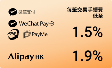 支援 WeChat Pay HK、微信支付、FPS轉數 手續費低至 1.5%;