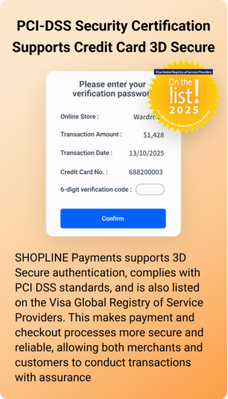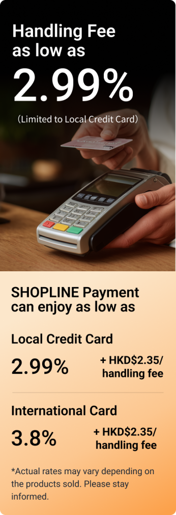 SHOPLINE Payments provides a one-stop OMO (Online Merge Offline) credit card service, coupled with SHOPLINE POS and credit card machine integration, to fully realize a seamless cross-channel transaction process! It supports multiple payment methods: VISA, Mastercard, Discover, JCB, Diners Club, Octopus, AlipayHK, Alipay CN, WeChat Pay, Apple Pay, and more.